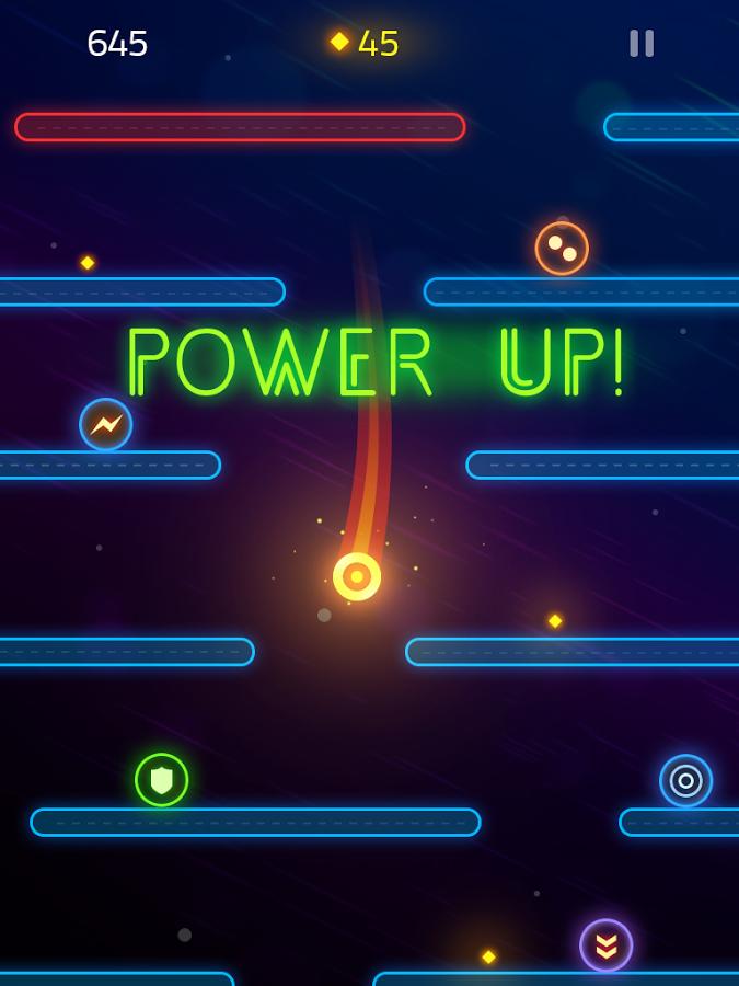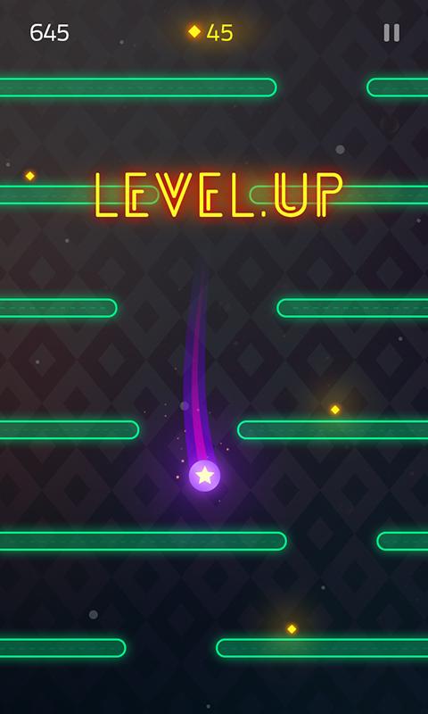 每当你突破50层的时候游戏就会升级,不仅场景会发生颜色的变化,画面上方的激光线也会越来越快的向你压来,而同时作为奖励,那些菱形能量也会成倍的出现,真的是高风险高回报啊!收集足够的菱形能量,你就可以在游戏的主菜单中定制解锁新的造型和游戏背景哦。