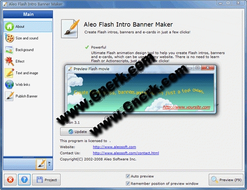Aleo Flash Intro and Banner Maker V3.1 英文绿色特别版 Amara Flash Intro and Banner Builder 这是一款可以帮助设计者制作和设计动画Flash介绍、Flash标识、Flash广告、Flash弹出菜单以及任何其它Flash动画的Flash文本效果工具。你可以在几分钟之内使用你自己的照片和音乐,联合它们和动画文本以创建看起来专业的广告、标识和简介
