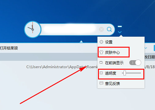 点击倒三角===点击皮肤中心就可以选择你自己喜欢的皮肤或者滑动透明度滑块。可以调节软件透明度