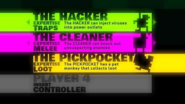 《摩纳哥:你的就是我》的是一款画面有点抽象的动作类游戏,本作中你可以通过联网和好朋友一起合作闯关,最多支持4人同时联机,你也可以通过STEAM平台来寻找一起玩的战友。
