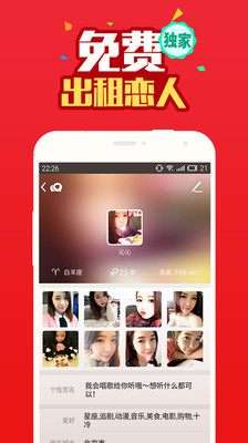 ★免费出租男女恋人。聊你想聊的,聊你不敢聊的;★超高缘分匹配速度。5秒钟即可找到男女恋人;