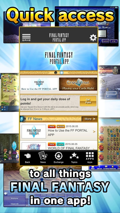 最终幻想门户是官方推出的最终幻想的门户应用,其中包含了非常多的有关最终幻想的资讯,一些喜欢这个系列的玩家应该会觉得这应用不错,尤其是其中的纸牌游戏更是可以愉快的消磨时间。