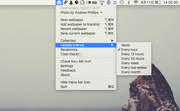 你可以利用热键切换新的壁纸,也可以选择“Randomize”随机显示壁纸,遇到不喜欢的也可以加入黑名单不让它再次显示;或者也可以自定义壁纸更换的时间间隔,比如按每小时,每 12 个小时等等以此类推。