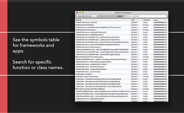Symbolist for Mac允许您搜索符号在可执行文件和objective - c运行时。支持查看和搜索应用程序或库中的符号的可执行文件。一切都是只读的,所以你的文件是安全的。支持搜索可可类和协议,认为他们的方法是可读的objective - c,过滤选择器生活类型。
