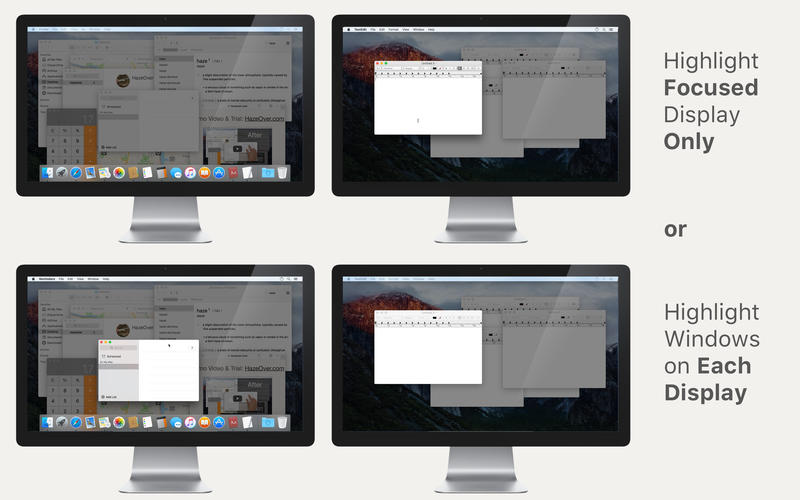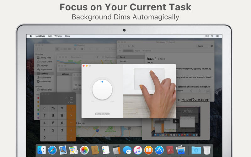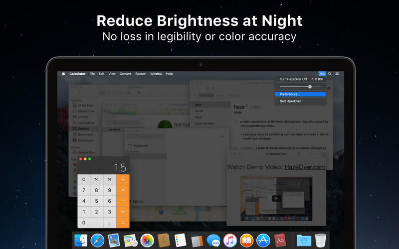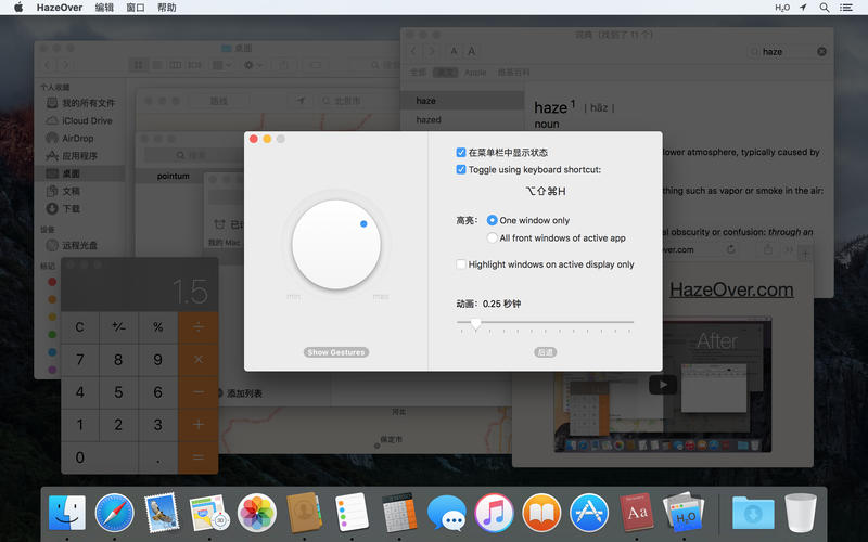 而仅仅系统级的暗黑模式只能对菜单栏和 Dock 栏有效果,而像笔者这种连 Dock 栏都设置为自动隐藏的用户来说,暗黑模式的局限就显现出来了。而通常情况下,人们会同时打开不止一个窗口在 Desktop 上,而例如系统级APP:邮件,日历,备忘录等等都是以明亮白色的设计格调为主,所以就经常会出现 Desktop 上“一片白”的情形。或者,一些用户会选择明亮的桌面壁纸,总之,在这“一片白”的情况下,即便是菜单栏和 Dock 栏为暗色调,我们都会觉得不够。所以就有了 HazeOver 的诞生。适用体验的效果和界面的层次感还是十分明显的,除了 Front APP 外的视窗全部变暗,降低可视度。