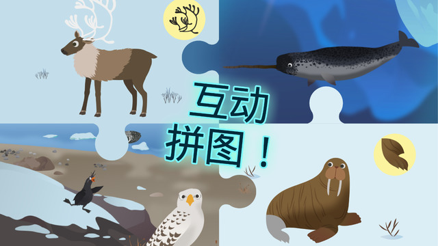 通过互动拼图使北极动物灵活展现!将每一块拼图拼对地方,你就了解每一种动物的特殊情况。