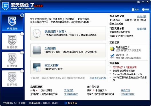 安天防线(原名木马防线,英文名Antiy Ghostbusters)是由安天出品的一款永久免费的杀毒软件。其基于安天AVL SDK反病毒引擎的优良性能,具有扫描速度快、查杀能力强的特点,能够彻底查杀系统中的顽固病毒和流行木马。作为进入全球知名软件排行榜AntiVirus TOP 50的第一款中国软件产品,安天防线始终以解决用户问题保障电脑安全为核心,为用户的信息安全铸造最坚固的防线。
