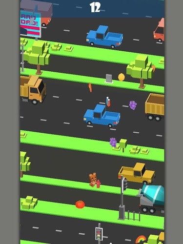 点击屏幕可让动物向前跳,向左划屏会向左跳,向右划屏则向左跳;每向前跳跃前进一条马路会增加分数,吃水果有额外奖励;