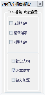 QQ飞车橘色辅助 3.0 免费版 qq飞车橘色辅助是一款2015年最新QQ飞车辅助,这款辅助又叫QQ飞车橘色加速辅助,它可以帮助你在游戏中进行加速,功能包括无限加速、超级强喷、引擎加速、锁定人物、发车提前、接力加速等等变态功能,喜欢玩QQ飞车的朋友千万不要错过这款辅助了。