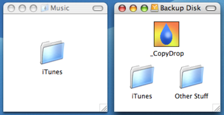CopyDrop for Mac的概念,使之可以使用Finder中拖放文件夹,卷和文件。这意味着相同的物品已在目标不会重新复制,节省时间。有两种模式,“取代”和“合并”。在“替换”模式,只存在于该目标的任何项目将被去除,使得其结果将是一个目的地相同的来源。在“合并”模式,在目标的唯一项目是原封不动使得目的地包含以前有(而不是在源中)的所有文件加在源中的每一个文件。