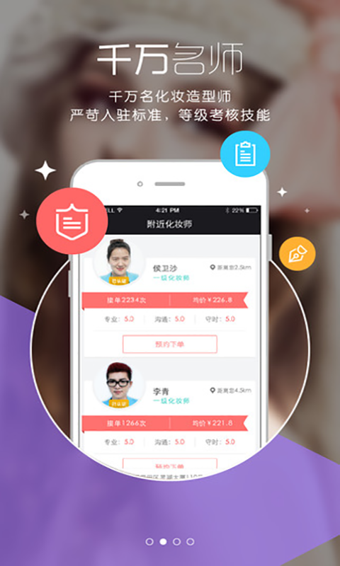 平台严格考核筛选几百名专业化妆造型师,手机一键预约,安全可靠、服务贴心,随时随地,为您提供上门化妆造型服务,是您身边最贴心的化妆造型师。