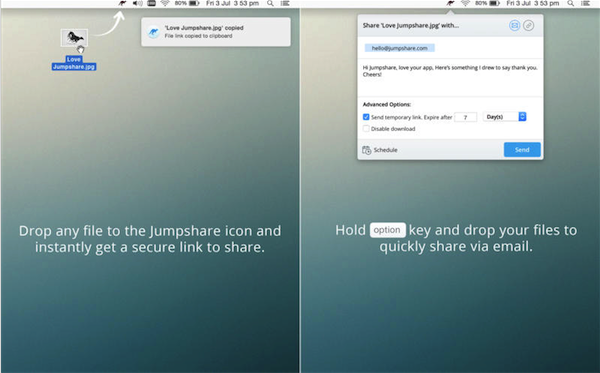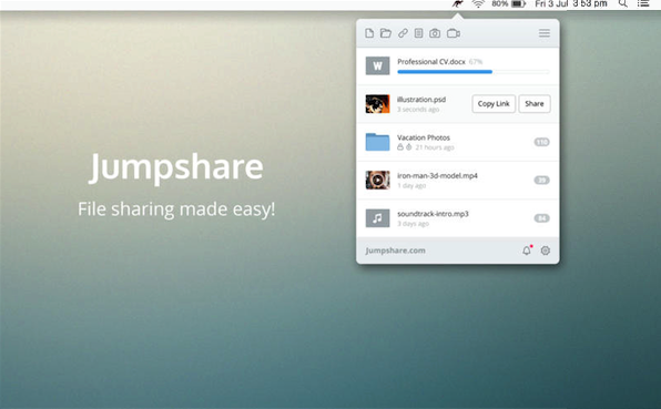 Jumpshare for Mac支持无限制的分享,共享任何文件都可以在线观看。保存上传的历史与实时文件查看次数。支持自定义文件浏览器主题,可以使用短或长的URL分享链接(提高安全性)。Jumpshare for Mac可以获取即时通知当收件人查看或下载文件之时。转贴,重命名或从菜单栏中popover窗口删除文件。可以共享笔记,使用截屏,和截屏定制的键盘快捷键。支持分享到社交媒体:Facebook和Twitter,自动检测您的网络设置,选择上传代理。