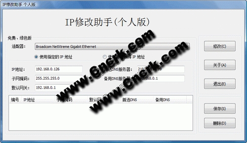 一款快速修改IP、子网掩码、网关、DNS的绿色、免费软件。适合于常常修改IP地址的工作人员