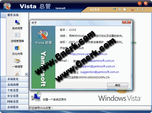 Vista总管是一款优化和设置Windows Vista的工具软件,它可以让你的Vista系统变得更苗条、更快、更安全和更个性化。它的主要功能主要分为信息、优化、清理、个性化定制、安全、网络和其他工具几大部分。