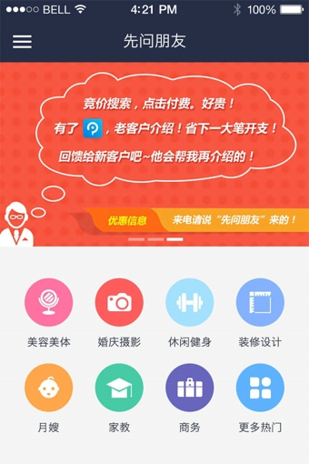 先问朋友安卓版是一款非常便捷好用的生活服务软件,涉及到装修、美容、家政、二手、婚庆、体育、摄影众多行业,无论你有哪方面的需求,都可以在先问朋友app中完成。