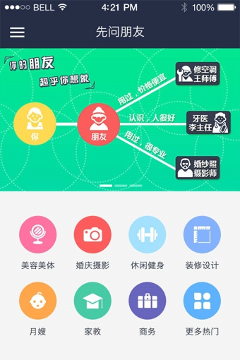 想找个靠谱点的服务提供者?以前我打电话、发短信,像个无头苍蝇到处碰壁。现在有了App先问朋友,duang,马上就知道结果!朋友用过,这样的服务,才靠谱!