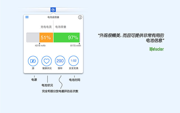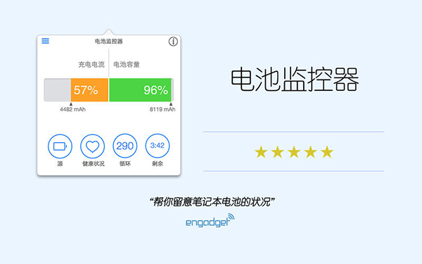 电池监控器mac是一款小巧又实用的Macbook电池保养、管理以及监控的应用程序,它不仅界面清爽简单,还可以轻松检查笔记本电池等等健康状况,更好的保护电池。