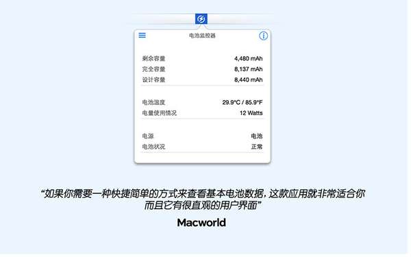 电池监控器 Mac版 V2.3 官方版 电池监控器mac是一款小巧又实用的Macbook电池保养、管理以及监控的应用程序,它不仅界面清爽简单,还可以轻松检查笔记本电池等等健康状况,更好的保护电池。