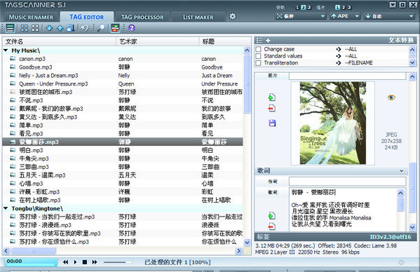 【Tag Editor】是标签编辑,支持单个和批量修改标签信息。在右边直接编辑,他会自动覆写到全部的ID标签上去,修改完后点击右下角的【保存】。