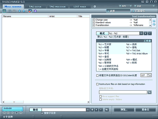 TagScanner 是一款支持批量更改音乐文件标签信息的工具。TagScanner 可支持从 Amazon 或 Freedb 网站的数据库中获取标签信息,并填充到你本地的音乐文件标签中,这将大大提高你的工作效率。不仅如此,TagScanner 还能通过文件名和文件夹名来获取信息。有了这些信息,为你的MP3更名提供了保障。TagScanner 可支持的音乐类型包括 MP3、OGG、Musepack、Monkey's Audio、FLAC、AAC、OptimFROG、SPEEX、WavePack、TrueAudio、WMA、MP4等。支持的标签类型包括 ID3 1.0/1.1/2.2/2.3/2.4 标签、APE v1 和 v2 标签、Vorbis 备注、WMA 标签 和 MP4(iTunes) meta信息。此外,TagScanner 内置的播放器可创建播放列表,并支持将播放列表导出为 HTML 或 Excel 文件。