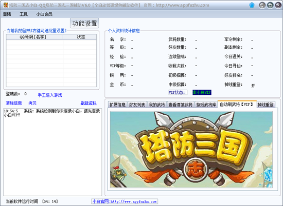 塔防三国志小白辅助是塔防三国志游戏中的一款辅助工具。该工具不仅小巧绿色,还拥有强大实用的游戏辅助功能,可以帮助玩家一键登录、自动挂机签到等,让玩家可以玩游戏更加轻松。