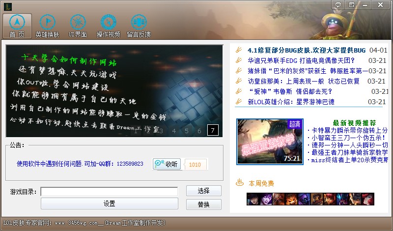 启动这款英雄联盟皮肤修改器之后,会弹出一连串的广告窗口,不影响使用,关掉就是了,进入辅助主界面之后,选择好英雄联盟游戏的安装目录,然后切换到英雄换肤,即可开始对lol中的英雄换肤。