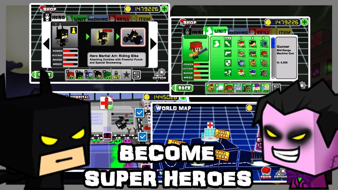 如今的美漫游戏似乎都很热衷于乐高的方块脸,英雄战争2僵尸病毒也不例外。作为一款向美漫致敬的游戏,方块便是这款卡通游戏的主基调。游戏中无论是僵尸、小兵、楼房甚至是英雄人物,全部都是四四方方、方方正正。至于小伙伴们喜不喜欢,这是小伙伴们自己的事= =。游戏的音乐也是采用非常具有美漫特色的动感电子音,配合激烈的鼓点,让我们相信电影里的超级英雄们即使再悲催,也总能在最后拯救世界。