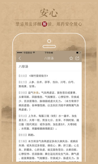 综合权威经典药方,帮您识别处方单上的药材信息,了解药方出处、功效、用法、禁忌、方解等,让您用药更安心;