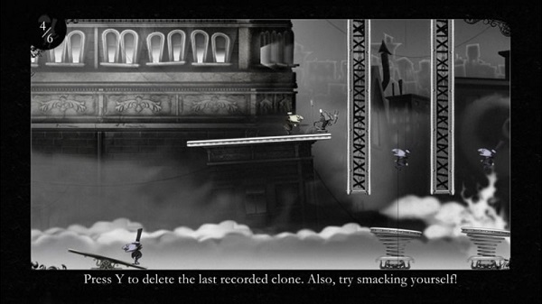 在《温特伯顿先生的不幸旅程》玩家想要利用跷跷板跳到高处,可以先在跷跷板的一端按住按键后跳跃,录制自己跳一下的动作,放开按键后就会出现一个分身不断地在原地跳动;这个时候赶紧到跷跷板的另一端,就可以让跳跃中的分身踩下跷跷板,把自己送到高处。当然这个只是最基本的应用方式,依照关卡的设计,玩家甚至需要一口气录制四到五个分身来辅助自己的行动。【使用方法】