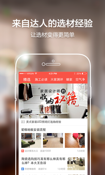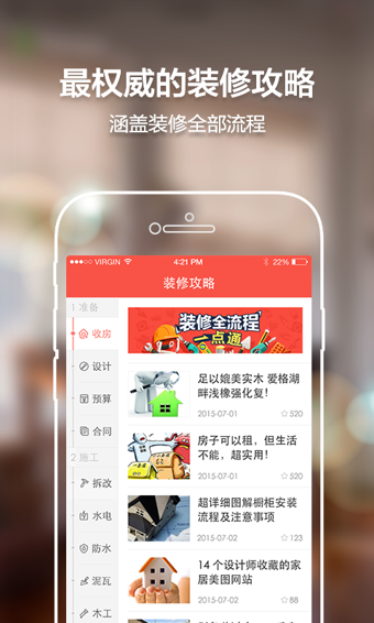 金九银十又到了装修的旺季了,大家装修app是一款国内最专业的建材家居导购的手机软件,轻松的为你解决装修过程中遇到的问题,有需要的赶快的来下载体验。【软件特点】