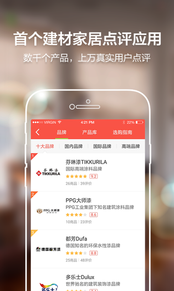 1.大量网友点评,全部真实可靠大家装修汇集多达二十多个品类的知名品牌建材产品,总计四千余款,提供最专业的品牌排行,拥有大量网友的真实点评,帮助业主轻松选择产品。