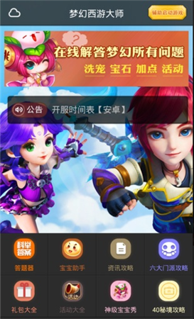 梦幻西游大师是由国内第一手游攻略"游戏大师"为各位梦幻手游玩家权威打造的梦幻手游辅助工具,在线解答梦幻西游手游所有问题,现在包含的功能有,科举答题器、礼包大全、加点模拟、门派测试、最强助战和宝宝助手等功能,还有最新开服表信息,是你手机里必备的梦幻西游手游攻略app。【软件特点】