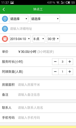 1、好看实用还免费(平台不收任何费用,按照市场行情给服务商结算费用),每个家政服务项目,都有超过30+服务商可以提供服务,10秒下单,10秒就有回应,比打电话还快吧!2、钟点工预约:只用填写服务日期、服务时长、地址、联系人、联系方式,就能一键发布,还支持在线付款哟,给父母预约一下送个惊喜,再好不过啦!
