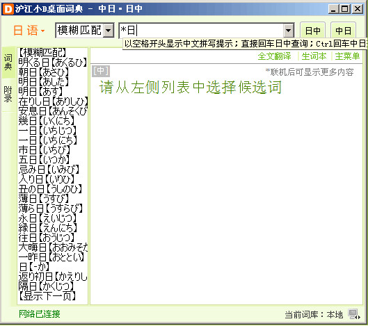 沪江小D日语词典是一款中日日中桌面词典软件,充分考虑中国人的使用习惯,为日语学习者度身定制。该词典拥有海量的日语词库,并支持屏幕取词、真人发音以及TTS朗读等功能。此外,它还集成了网络词库和网络生词本,并提供了专业的日文翻译、强大的模糊查询、及优秀的日语在线翻译等服务。沪江小D日语词典涵盖所有日汉翻译功能,囊括日语单词的发音,解释,参考例句等内容,是极具人气的在线词典,欢迎下载使用!