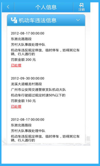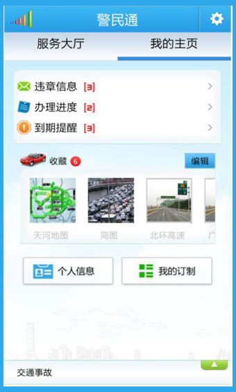 (5)个人定制与互动分享:绑定个人资料更可获取及时的违法和车辆年审、驾照到期提醒,同时还可通过微博、微信将实时路况等分享至自己的好友圈。