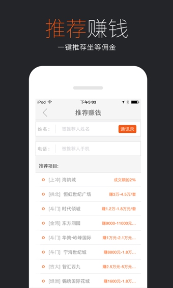 只要注册成为幸福合伙人,人人都可赚高出市场平均水平10倍的以上佣金。如果亲友要买房,只需按“推荐赚钱”,输入被推荐人的姓名和手机号码,就可坐等收佣金,幸福家后台管理系统和线下团队会提供最好的跟进服务。幸福家O2O房产全民赢销平台,全国首创“幸福合伙制”,建立经纪人、开发商、客户和幸福家四位一体的生态圈。整合“幸福合伙人”,“幸福联盟商”、“幸福代理商”,以“经纪联盟”的形式开创一手、二手代理全民“赢销”的新模式。