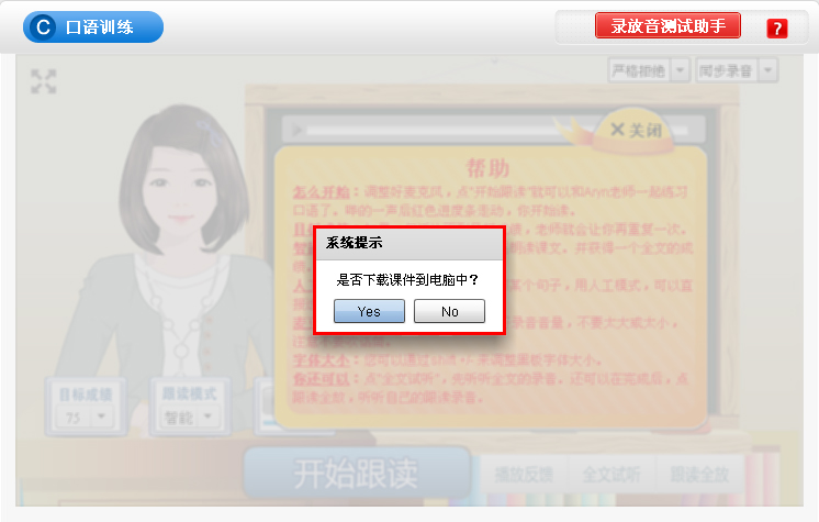 1、下载课件:安装软件后,选择课程列表的课后,会弹出提示“是否下载课件到电脑中”,点击“yes”进行下载。开始下载文件,左上角并有进度提示。下载成功后,开始跟读时就会从电脑中读取课件进行跟读,解决网络不稳定问题。