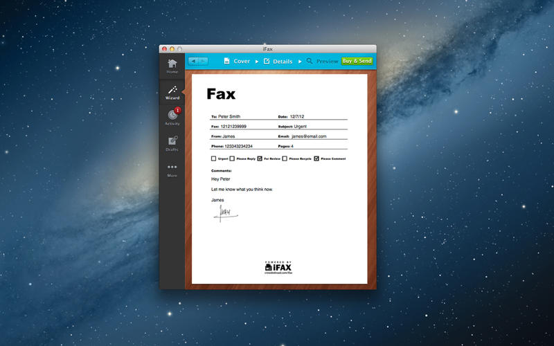 iFaxforMac是一个快速而简单的向导。只有几个接口可以创建和发送一个定制的传真至任何地方,随时随地。随附你的标志和签名。将你的公司标志传真封面,然后添加数字签名寻找个人联系。提供封面模板。选择各种主题的封面上包括经典,现代城市,时髦的,休闲的风格。封面页是可选的。传入传真技术。选择一个本地或免费传真号码在世界任何地方。