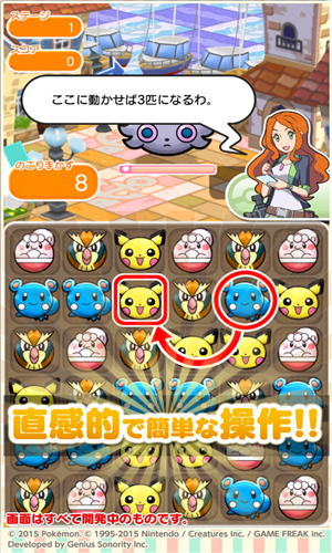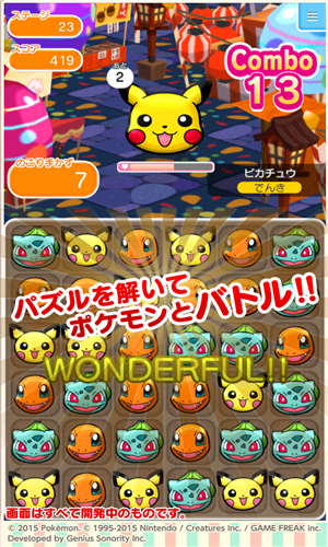 消去3只并排的同样的口袋妖怪,在规定的时间把“野生妖怪”的HP清0的话,就算过关。根据不同的属性而攻击力不同,在画面中有技能发动槽,如果积满的话,就能发动强力的效果,游戏中也采用以前口袋妖怪们的特征。
