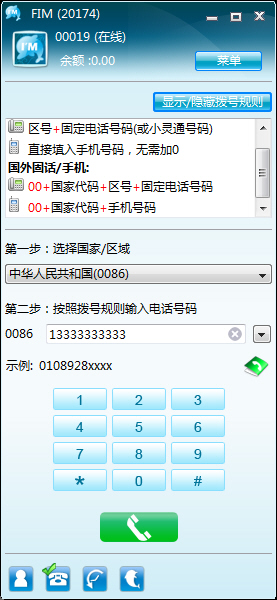 使用FIM直接拨打全球座机和手机,国内长途只需0.119元/分钟,参加优惠充值活动,更低至0.04元/分钟!