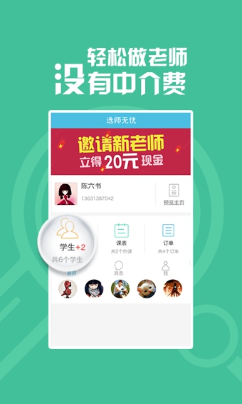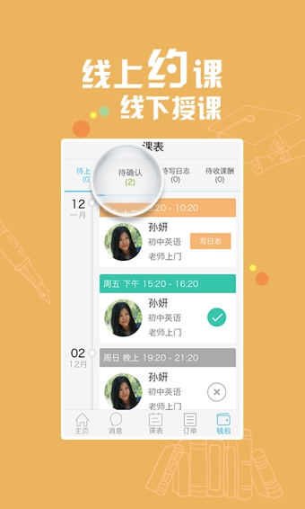 1、首页:查看和修改个人主页,查看自己的学生,查看未付款订单数、约课情况等功能。2、课表:查看自己上课时间以及约课地点。