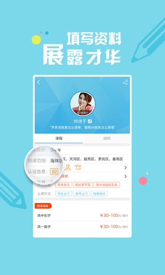 3、编辑资料:编辑个人信息、开设年级科目、编辑科目价格,还能上传照片。