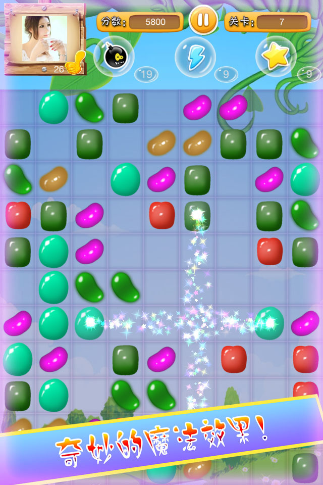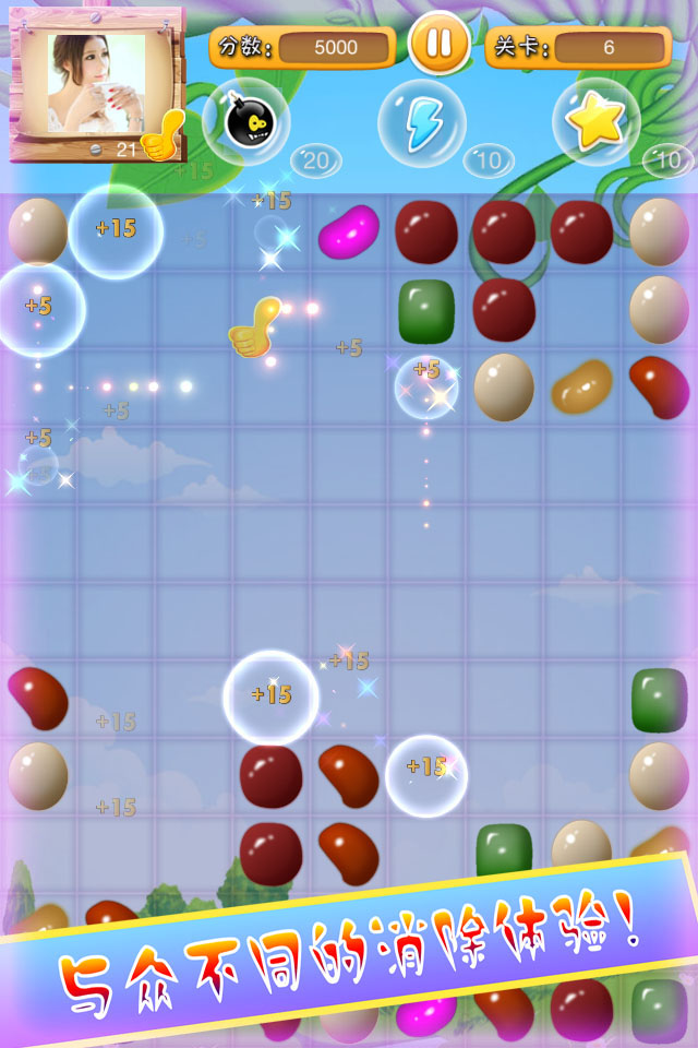 -没有时间限制,消除每关所有豆豆即可过关,非常休闲,适合打发无聊时间挑战模式-首关时间60秒,消除的每一颗豆豆加0.5秒,过一关加10-30秒的时间,直到时间减到0,游戏结束统计最高分,然后可以打开排行榜查看在美女中排第几名,有没有跟美女搭讪的机会;