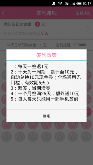 新增签到功能,签到1次,送1元,连续签到10次,则送更多。