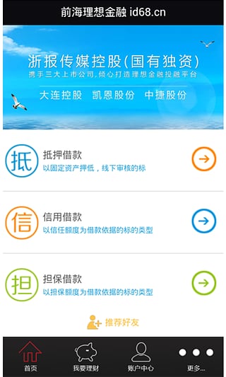 前海理想金融是以互联网金融和财富管理为核心业务的大型综合性金融服务机构,由浙报传媒控股集团(国有独资)携手大连控股、凯恩股份、中捷股份三家国内上市公司及多家知名企业联合发起。前海理想金融致力于为中小微企业提供投融资新渠道, 为个人提供创新型投资理财服务,预期年收益是银行活期的34-42倍,由实力雄厚的融资性担保公司全额保障,高收益低风险、轻松理财!
