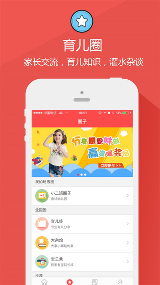 班级圈:查看幼儿所在班级活动、教学、饮食,与同班老师与家长在线交流;