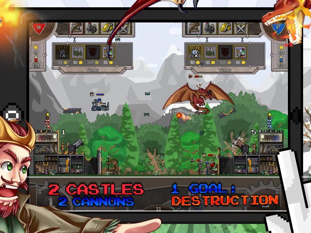 游戏画面采用略带复古的像素风格,粗中带细,要素丰富。玩家用左右滑杆控制加农炮的弹道和力度,目标是对面敌人的炮台和城堡。游戏共有40个关卡,设计了4个不同主题的场景,不同场景下会发生不同的事件和天气类型,考验你对炮台的掌控能力。完成40个关卡后便会解锁困难模式下新的40关,挑战更强悍的漫长历史战役。除此之外游戏还有生存模式和任务模式供玩家尝试,厌倦了一个人的寂寞闯关,还可以和朋友在同一台设备上展开对战,或者通过蓝牙/WIFI连线相互比拼攻防本事。