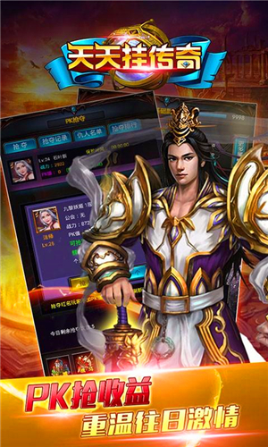 《天天挂传奇》请!注!意! 这是首款HTML5版本的放置类传奇挂机手游。和其他放置类游戏相比,游戏中除了自动挂机,还可以PK抢夺、攻打皇城、寄售装备!让你重温往日激情! 你所要做的就是挑选最好的装备给你的人物和佣兵穿上,不断挑战BOSS和PK其他玩家,带领行会成员攻占皇城,最终达到实力的巅峰,迎来无限的荣耀。