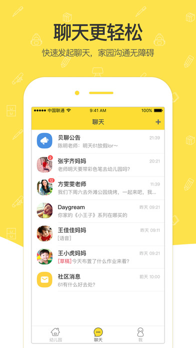 贝聊是免费的家园共育平台,可免费发送视频、图片和文字等信息,并提供单人和多人在线聊天,可以方便学校幼儿园、教师和家长进行沟通。贝聊针对幼儿园的特性,加强了封闭性,保证孩子的信息安全存储。同时,特有的超大批量图片上传和双方通知提醒功能,让老师和家长的沟通更简单;