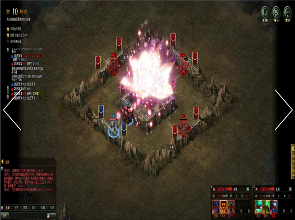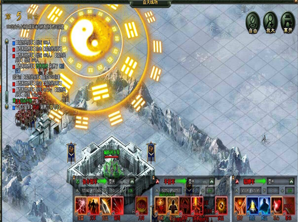 6、右上角的大势图,显示了当前游戏中各个城市的归属情况,其中汉朝的城市显示为红色,黄巾的城市显示为紫色,魏国的城市显示为青色,蜀国的城市显示为黄色,吴国的城市显示为绿色。点击大势图右下的按钮,可以在行营/大地图场景之间进行切换。